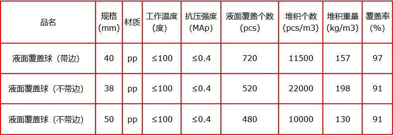 1.液面覆盖球以聚丙烯pp为原料,经发泡、收缩生产的圆形塑料填料,分带边液面覆盖球与不带边液面覆盖球两种型号,带边液面覆盖球具有重心稳定,边与边重叠,覆盖效果好等特点,其作用是抑制酸雾挥发,保护操作人员健康,减少大气污染和空气对水质的污染,有效提高凝结水质量,有利于发电机组、供热机组的安全运行。液面覆盖球经过大量科学实验,它有效地解决了液面覆盖技术难题,可保护水质、净化环境、安全防火、节约能源。产品特点 1.设计精巧合理,外形美观。选材得当,耐酸耐压(耐压0.4MPa,耐酸度为35%浓盐酸,工作温度≤100℃)